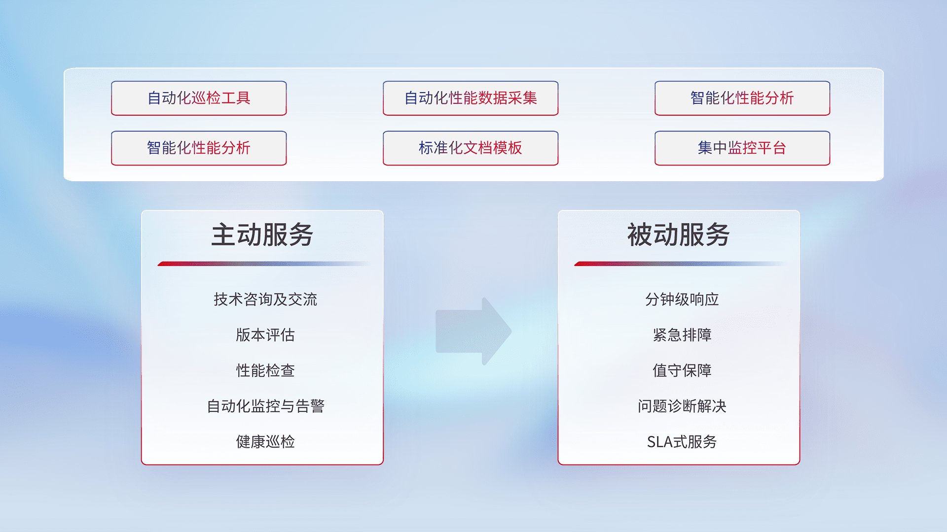 智能化工具和标准化文档,,,,保障服务质量,,提供主动服务(包含技术咨询、、、版本评估、、、、性能检查、、、自动化监控与告警、、、、健康巡检)和被动服务包含(分钟级响应、、、、紧急排障、、值守保障、、、问题诊断解决、、、SLA服务)。。。